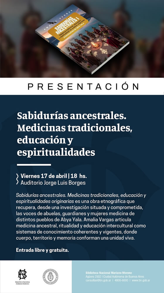 Extendemos la INVITACIÓN ABIERTA a la presentación del Libro Sabidurías Ancestrales: Medicinas, Educación y Espiritualidad, de Amalia Vargas. Que se llevará a cabo el viernes 17 de abril de 18:00 a 20:00 hs en la Biblioteca Nacional